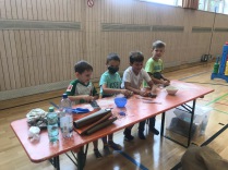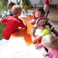 Kinder lieben es mit Farbe zu experimentieren und haben sofort etliche Ideen wie man tolle Bilder erzeugen kann. Trotz Regen zog es einige Kinder trotzdem nach draußen und so wurde unterm Dach Vier-gewinnt gespielt, Seil gesprungen und Softballtennis gespielt.