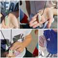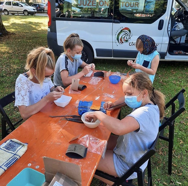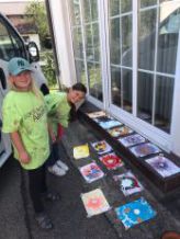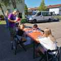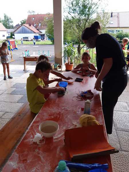 Die zweite Tour führte uns nach Ettringen. Um jeden Preis mitmachen, hieß es nach einer kleinen „Hygiene“ Einweisung für 12 Kinder aus Ettringen. Die Kinder ließen sich inspirieren von unserem regenbogenbunten Material-Angebot für alle nur denkbaren Techniken der Farbschleuder. Glitzer durfte da nicht fehlen. Andere Kinder waren entdeckungsfreudiger und wollten aus dem Rohmaterial des Specksteines ihre eigenen Kettenanhänger gestalten. Da waren sie hier genau richtig. Entstanden sind einige tolle einzigartige Anhänger. Ein plötzliches Ende nahm unsere Tour, als ein Gewitter aufzog, aber alle Kinder waren zufrieden und machten sich mit Ihren selbst erstellten Sachen auf den Heimweg.