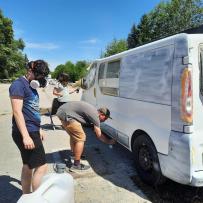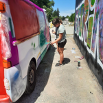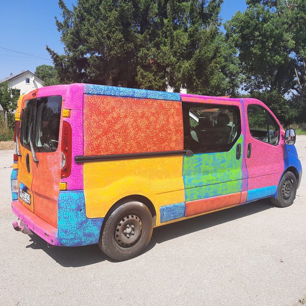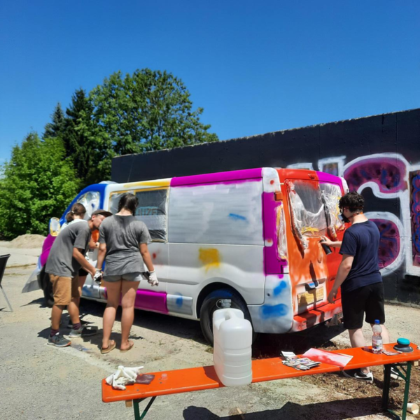 Den Bus bunt zu gestalten war wirklich eine Mammutaufgabe, zumindest bei diesen heißen Temperaturen. Erst ging es ans Schleifen, anstrengend aber eine der leichteren Aufgabe. Abkleben, Grundieren und die erste Schicht mit Schablonen auf den Bus sprühen, hat so viel Zeit beansprucht, was wir total unterschätzt hatten. Leider konnten wir unser Projekt nicht ganz vollenden, was wir aber Ende Juli nachholen.
