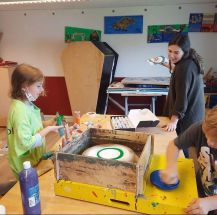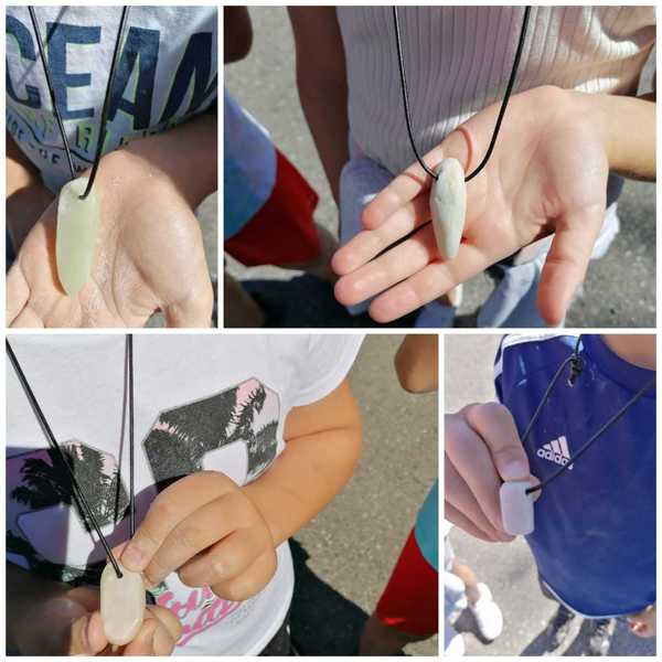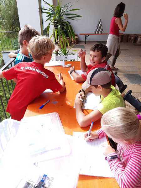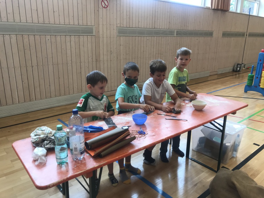 Für unsere Fahrt nach Dirlewang wurde leider kein „Sommerwetter“ angesagt. Zum Glück organisierte kurzfristig für uns der Bürgermeister Herr Mayer den Zugang zur Turnhalle als Ausweichmöglichkeit. Tolle Idee, denn somit konnten die Aktionen trotz Regenwetter stattfinden. Wir verbrachten gemeinsam mit 16 Kinder einen tollen Vormittag. Mit viel Kreativität und Begeisterung entstanden Specksteinketten und Schatzkästchen. Die Specksteine wurden von den Kindern selbst geschliffen, was für einige eine Herausforderung war, aber es machte trotzdem großen Spaß die Steine in kleine Kunstwerke zu verwandeln. Das Gestalten der Schatzkästchen bereitete allen viel Freude. Glitzer, Herze oder bunte Steine, alles fand seinen Platz auf dem Kästchen. Bewegung kam auch nicht zu kurz, denn während sich die Jungs beim Pedalo-Wettrennen und Fußballspielen austobten, spielten die Mädels "Vier gewinnt" und testeten ihre Wurfkünste am Wurfbaum aus. Alle waren sich einig, es war ein toller Vormittag…