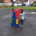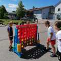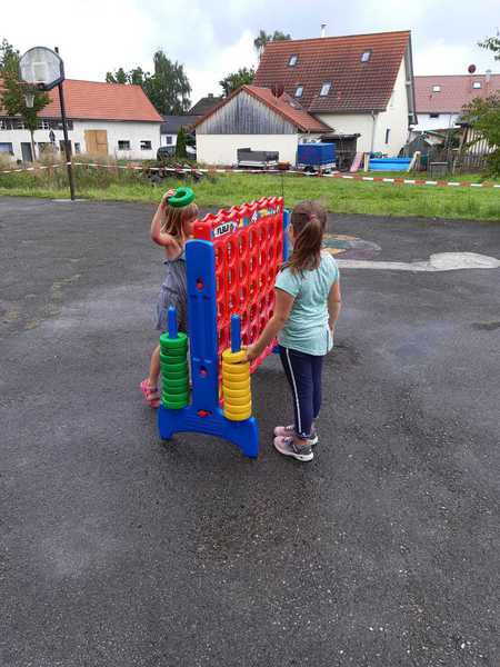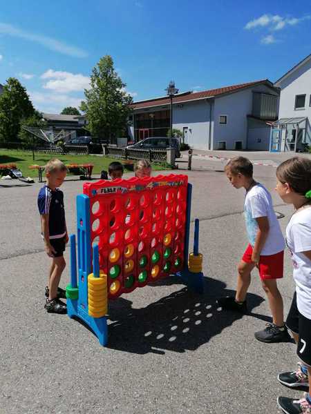 Unsere letzte Tour in den Sommerferien führte uns nach Lachen. Zuerst bauten wir alle Aktionen bei leichter Bewölkung auf dem Pausenhof der Grundschule auf. Kurze Zeit später machten uns Regenwolken einen Strich durch die Rechnung und im Regen – es regnete wirklich stark, mussten wir und die 18 Kinder plus Betreuer alles unters Vordach räumen. Obwohl wir alle ein wenig durchnässt waren, ließen wir uns die gute Laune nicht verderben. So wurden voller Begeisterung Dosen geworfen, eigene Farbschleuderbilder gestaltet, Specksteinketten geschliffen oder Stadt-Land-Fluss gespielt. Als es zum Regnen aufhörte, konnten die Kinder auch wieder unter freiem Himmel "Vier gewinnt" und Fußball spielen. Wir bedanken uns bei der Gemeinde Lachen für tolle Zusammenarbeit und freuen uns auf ein Wiedersehen!