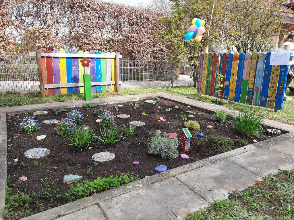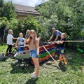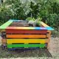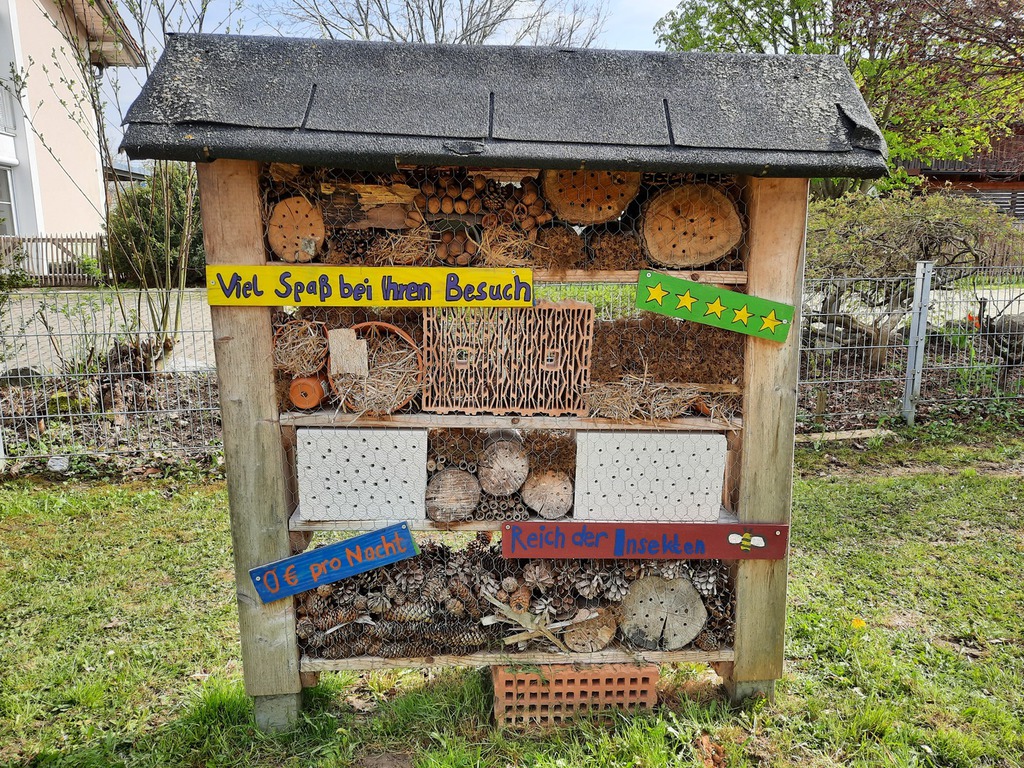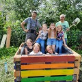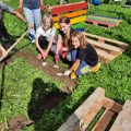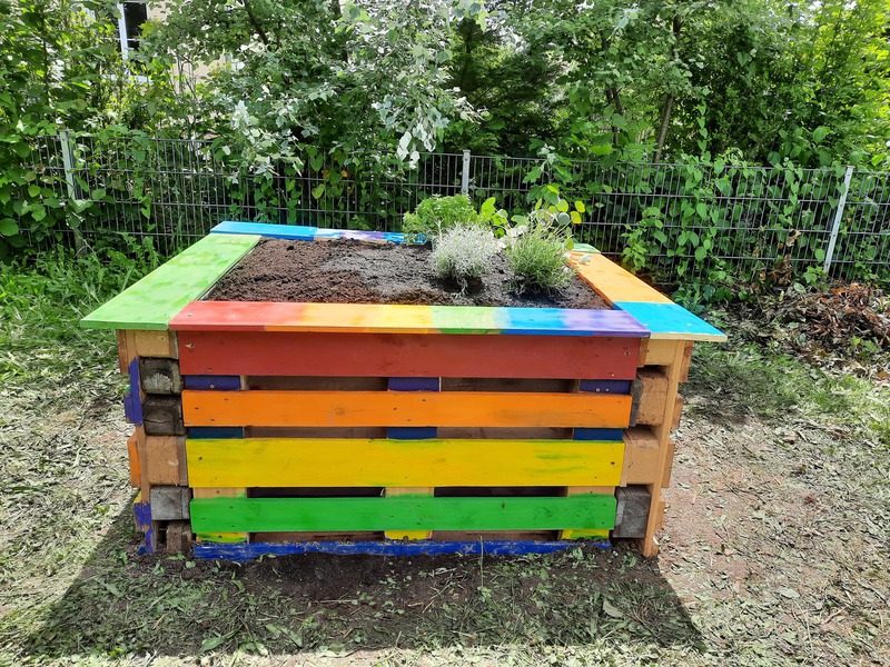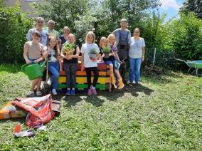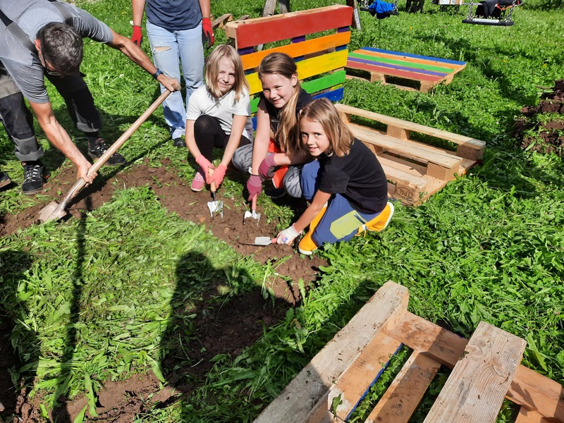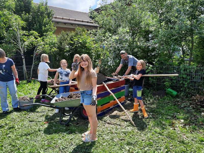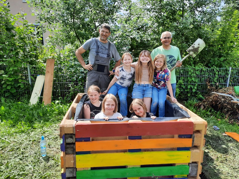 Am 22.06. versammelten sich Kinderparlamentskinder der Umweltgruppe rot und Mitglieder des Obst- und Gartenbauvereins, um im Garten des Dorfladens ein Hochbeet zu bauen. Die Idee, ein Hochbeet zu bauen, hatten die Kinder bereits im Herbst und so ging es an die Vorbereitungen. Es wurde ein Video zu Hochbeeten aus Paletten angeschaut, Materiallisten geschrieben und schließlich die Paletten und Bretter bunt bemalt. Zum Glück erklärten sich Vorstände des Obst- und Gartenbauvereins bereit, diesen Wunsch der Kinder gemeinsam mit uns umzusetzen. Sie besorgten Füllmaterial und brachten ihre handwerklichen Fähigkeiten und ihr Wissen ein. Bewaffnet mit Spaten und kleinen Schaufeln wurden zuerst Rinnen gegraben und schließlich die Paletten mit der Wasserwaage ausgelotet. Unter Anleitung wurden die Paletten zusammen-geschraubt und weitere Latten daran befestigt. Inzwischen maßen andere die Folie aus, schnitten sie zurecht und brachten das Hasengitter auf dem Boden an. Das Festtackern der Folie machte den Kindern besonderen Spaß. Nach einer Brotzeit ging es ans Befüllen mit Zweigen, Hackschnitzeln, Kompost, der extra angeliefert wurde, Pferdemist und Hochbeeterde. Als dann noch die Ablagebretter angebracht waren, war die Freude groß. Jetzt hoffen wir, dass die Kräuter und das Gemüse, das wir gepflanzt haben, gut wachsen und reiche Frucht bringen!!!