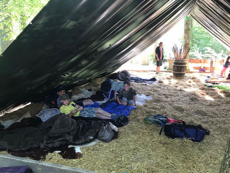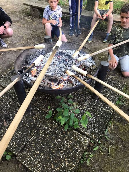 Zurück im Waldorado Camp, erkundeten wir das weitläufige Gelände und richteten unser Nachtlager im großen, offenen Zelt ein. Hier waren ein bisschen Mut und Abenteuerlust gleich am ersten Tag gefragt. Auge in Auge mit dem Wolf - denn unser Nachlager befand sich direkt am Wolfsgehege. Zum Abendessen grillten wir am Lagerfeuer Stockbrot und Würstchen, somit waren wir gestärkt für Wolfsgespräch und Nachtwanderung. Als die Dunkelheit langsam hereinbrach, saßen wir am Wolfsgehege, lauschten dem Wolfsheulen und lernten von einem Mitarbeiter am knisternden Lagerfeuer, mehr über die geheimnisvollen Tiere der Nacht. Das Highlight für alle war, das Anfassen eines echtes Wolfsfell und das Skellett von einem Wolfskopf. Die darauffolgende Nachtwanderung hat nun all unsere Sinne auf die Probe gestellt. Geheimnisvolles Rascheln im Dunkeln, laute Rufe eines Uhus oder Eule und das Heulen der Wölfe, wir waren erstaunt was alles zu hören war. Nach all diesen Eindrücken krochen wir müde, aber glücklich in unsere Schlafsäcke.