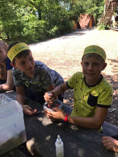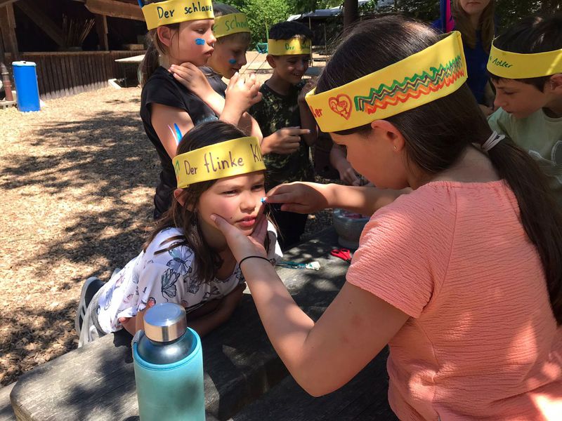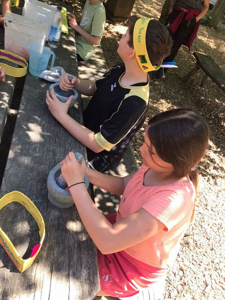 der Programmpunkt durften sich die Kinder einen eigenen Namen geben und gestalteten ihren eigenen Kopfschmuck. Mit Mörser und Stößel stellten wir die Farbe her mit welche wir unsere unsere Gesichter