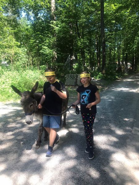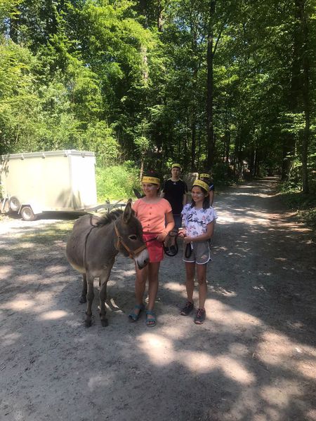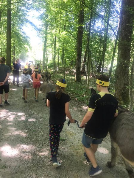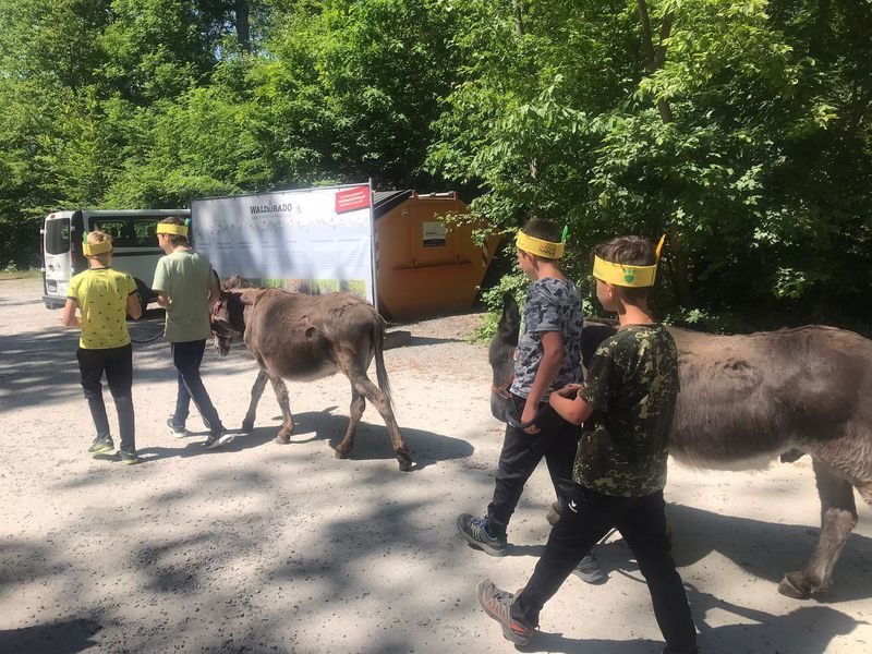 bemalten. Nun waren wir bereit für unser nächstes Abenteuer, Tierkarawane. Zusammen mit vier Esel, die breits auf uns warteten zogen durch den Wald. Jeder durfte abwechselnd einen Esel führen. Im