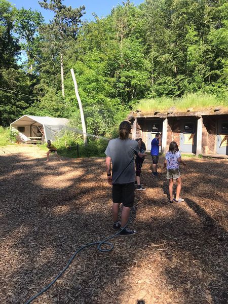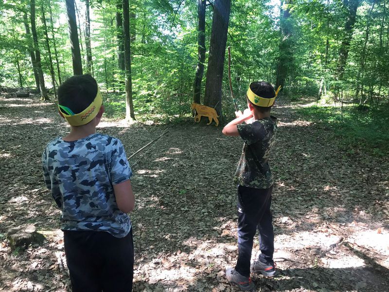 stellten wir unsere eigenen individuellen Bögen und Pfeile her. Anschließend machten wir Jagd auf die vielen lebensgroßen Holztiere, die im Wald standen.